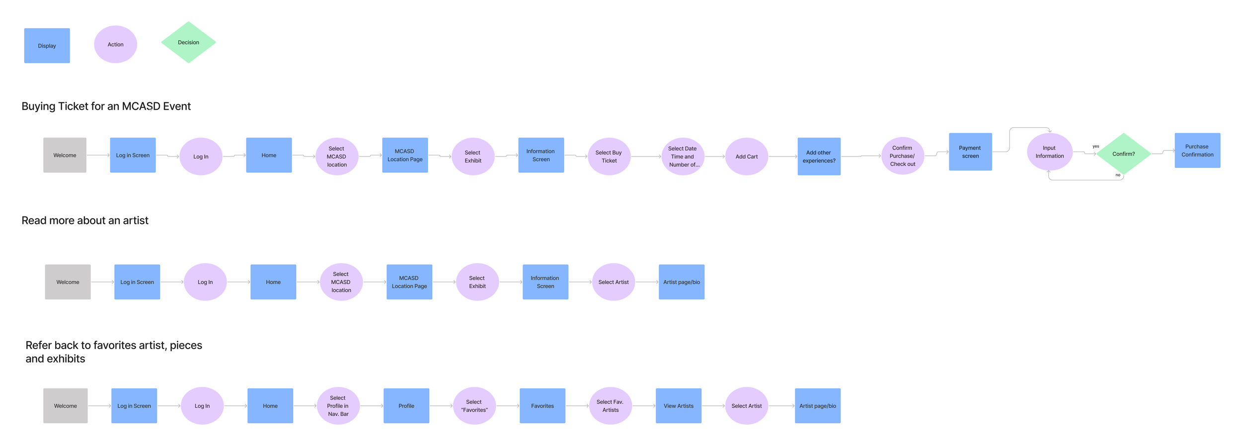 I created a sitemap to organize the features and information based on the chart above. I also created three Userflows in alignment with user needs to base the prototype on: 1. Viewing and Reserving a Ticket for an Exhibit 2. Exploring More about an Artist and Their Art Style 3.Referring Back to Favorites