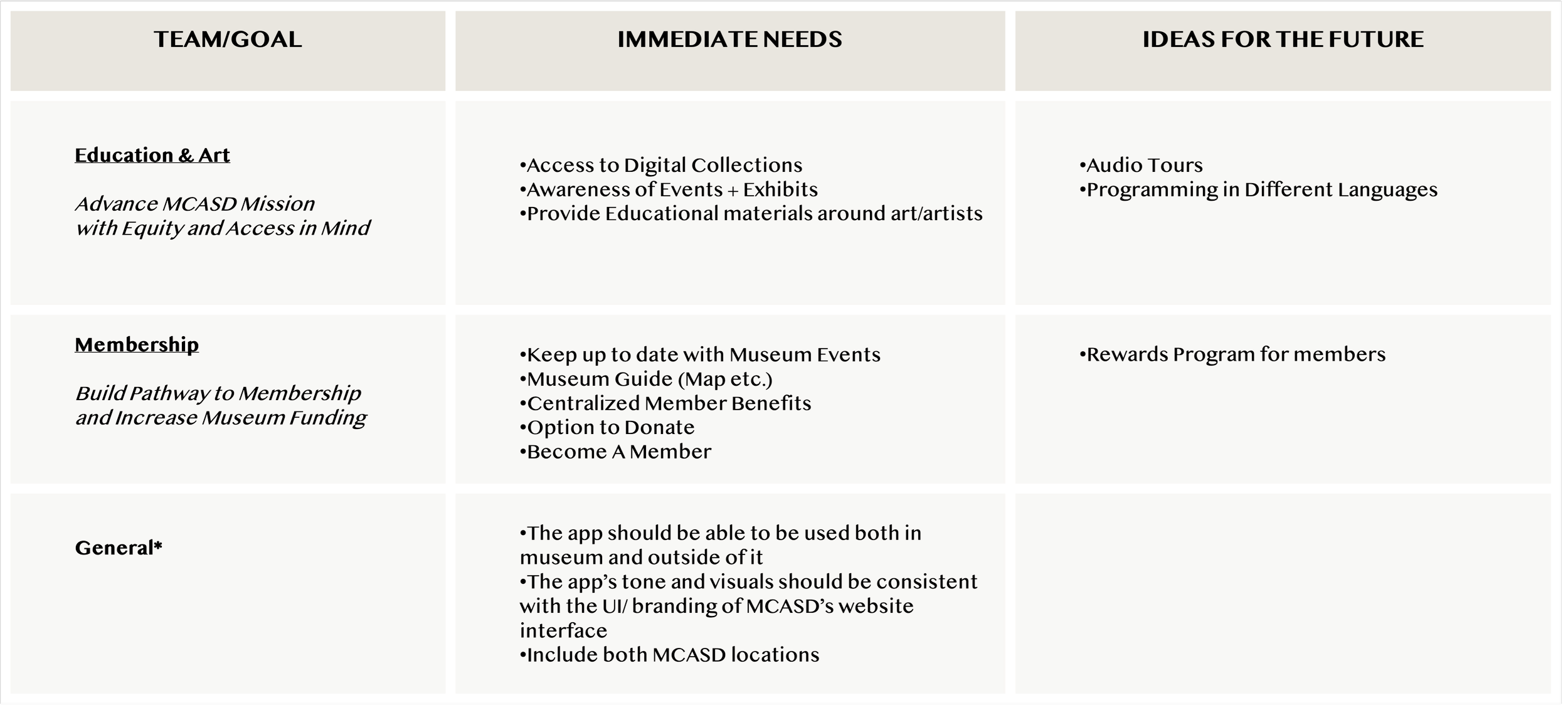 I interviewed 2 staff members from the Education and Engagement Team & 1 from the Membership Team to explore their needs. I summarized the immediate needs of MCASD against their constraints.