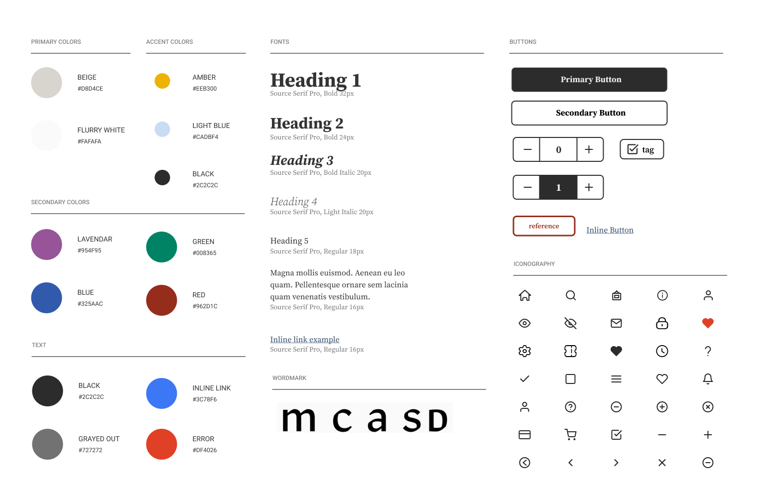 I studied the MCASD website to draw from their branding and create consistency between the app and the website’s design. Afterward, I created the following moodboard and style guide, pulling from MCASD’s branding and other art museum apps for inspiration. I made slight changes to the typography and color selection for accessibility purposes and to give the app a more modern feel.