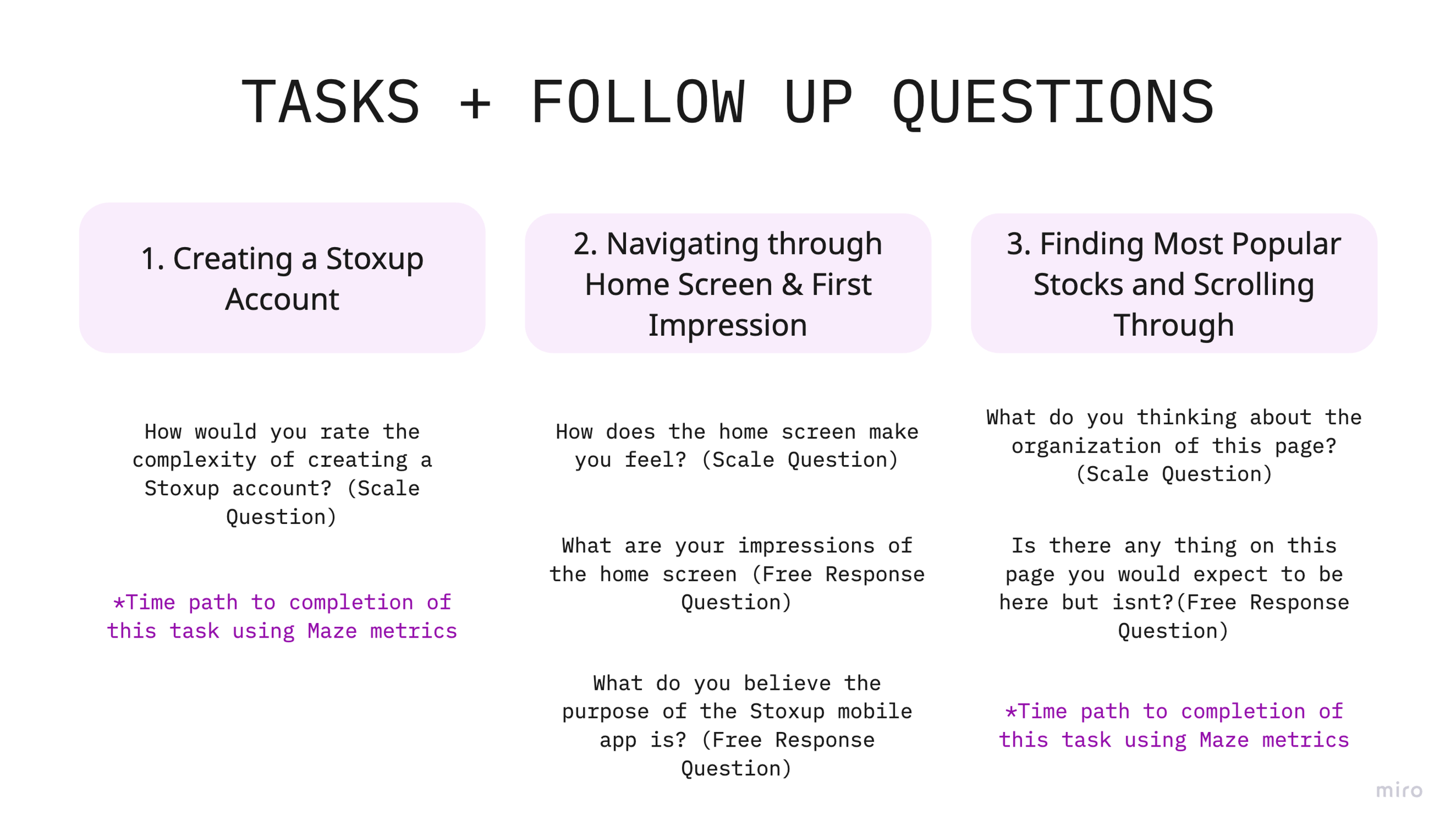Unmoderated Usability Testing: Once the testing population was confirmed through a screener survey, we performed unmoderated user testing using Maze on seven participants who were aged 18+ and followed or are interested in stocks, cryptocurrency, or financial planning. We documented our results in more detail in this test report.