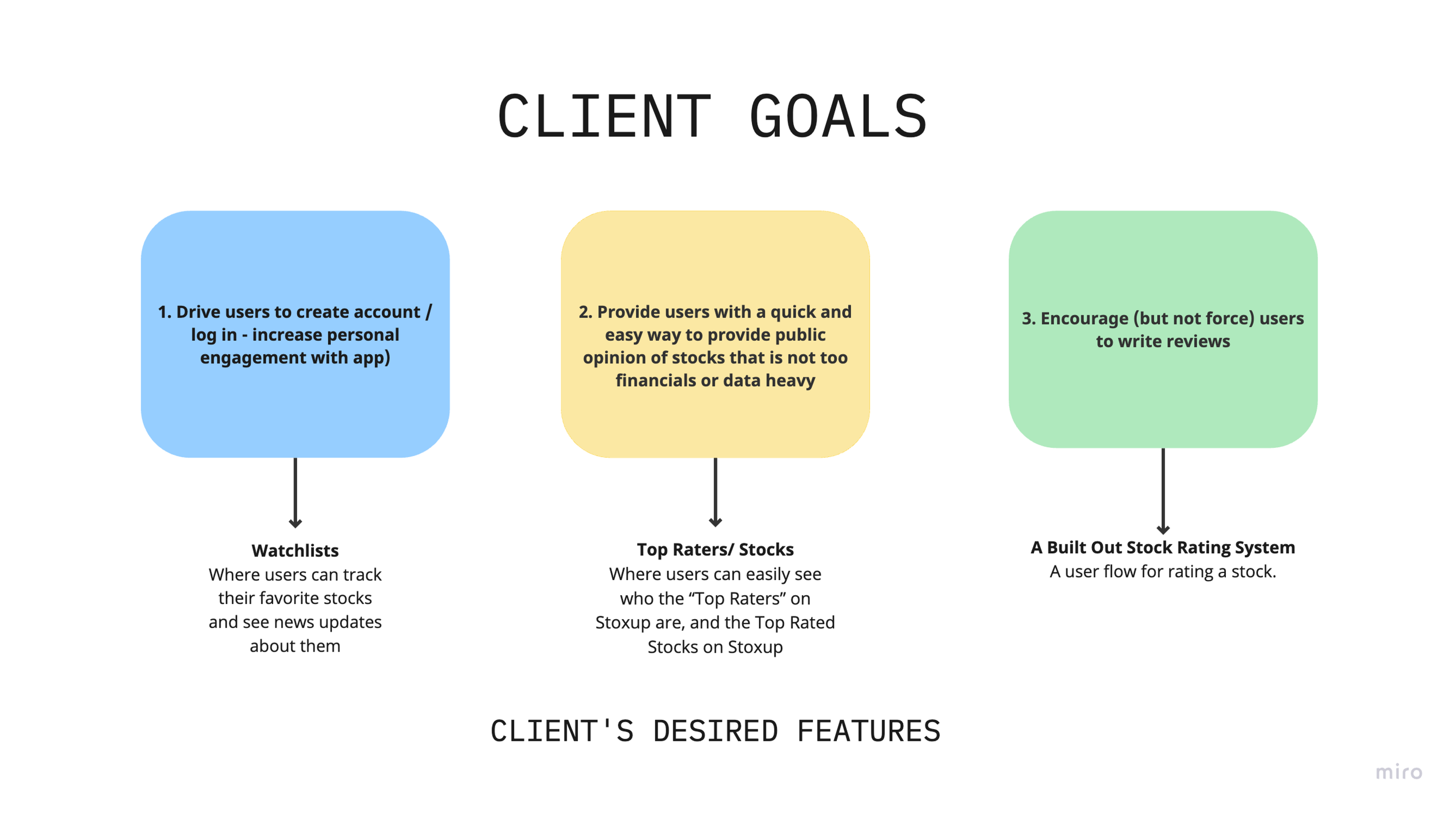 I facilitated a meeting with the client to propose our new changes and direction. I also took the opportunity to ask clarifying questions about Stoxup’s rating system. While in the meeting, he introduced a new feature for us to incorporate; a basic portfolio feature. We compiled the notes from this meeting and began iterating on different design solutions.